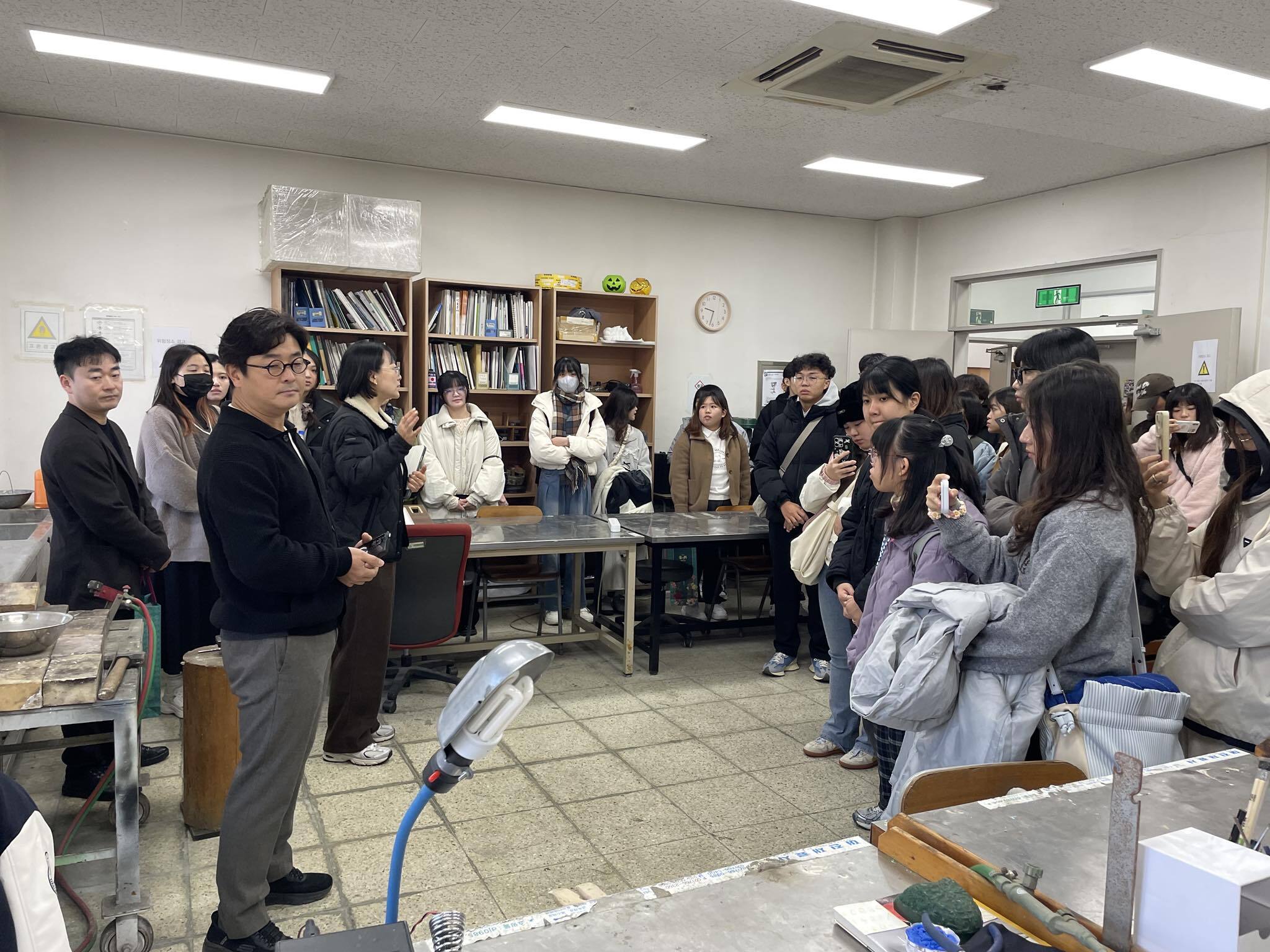 第二天行程來到位於大邱大學,早上在藝術與設計學院院長的帶領之下參觀學院各個科系環境與設備,深入參訪產品設計系的專業空間,包含四間專業的金工教室、一間造型教室,更有幸看到該系學生自組社團ARKHE所辦的媒材與花器/燈飾展,整個早上收獲滿滿。